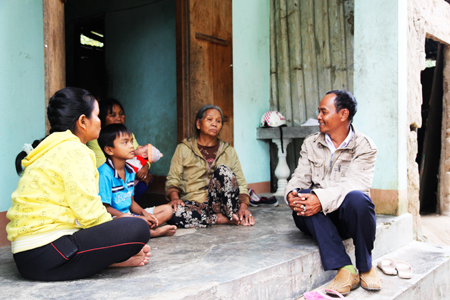 | Ông Hà Văn Xuân (bìa phải) trò chuyện với người dân trong thôn |