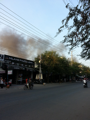 | Tiệm sửa xe sát nhà số 21 của ông Nguyễn Thế Thanh Nam phải di chuyển nhiều xe của khách ra đường Phước Long để tránh ngọn lửa. |