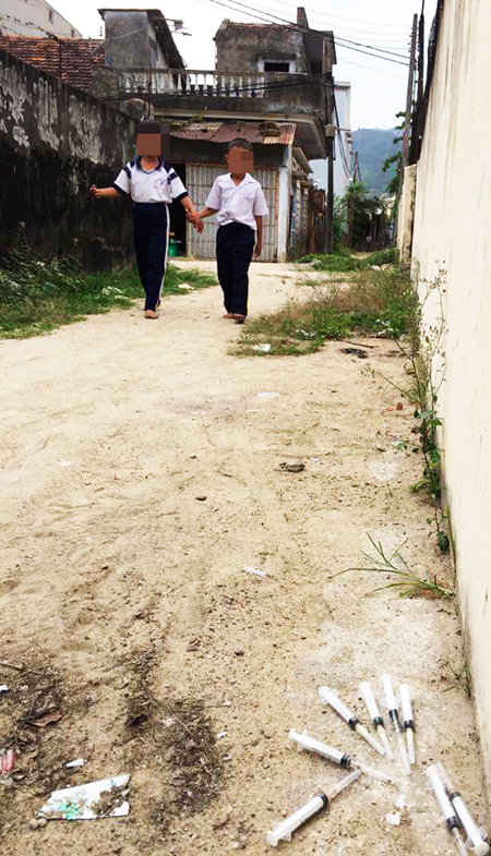 Đáng lo ngại, khu vực thường xuất hiện các đối tượng tiêm chích lại nằm giáp ranh với Trường Tiểu học Đại Lãnh 2. Vào giờ ra chơi, nhiều học sinh chạy ra phía sau con hẻm để chơi trò trốn tìm nhưng không mang giày, dép, nguy cơ đạp lên các ống bơm kim tiêm dính máu rất dễ xảy ra. Một học sinh lớp 3 nói với chúng tôi: “Ngày nào chúng cháu cũng nhìn thấy bơm kim tiêm, mới đầu thì sợ nhưng riết rồi cũng quen”.
