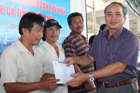 | Ông Nguyễn Hòa – Chủ tịch Liên đoàn Lao động tỉnh Khánh Hòa trao hỗ trợ cho ngư dân khó khăn. |