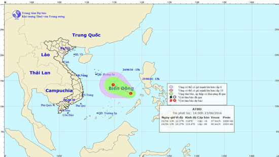 Chiều nay (23-6), vùng áp thấp trên khu vực giữa biển Đông đã mạnh lên thành áp thấp nhiệt đới. Hồi 15 giờ, vị trí tâm áp thấp nhiệt đới ở vào khoảng 12,6 độ Vĩ Bắc; 117,8 độ Kinh Đông. Dự báo trong 24 giờ tới, áp thấp nhiệt đới di chuyển theo hướng Tây - Tây Bắc, mỗi giờ đi được khoảng 15-20km và còn có khả năng mạnh thêm. Đến 13 giờ ngày 24-6, vị trí tâm áp thấp nhiệt đới ở vào khoảng 14,5 độ Vĩ Bắc; 113,5 độ Kinh Đông, cách quần đảo Hoàng Sa khoảng 270km về phía Đông Nam. Sức gió mạnh nhất ở vùng gần tâm áp thấp nhiệt đới mạnh cấp 6-7 (40-60km/giờ), giật cấp 8-9. Do ảnh hưởng của hoàn lưu áp thấp nhiệt đới, vùng biển phía Đông khu vực giữa biển Đông có gió mạnh cấp 6, giật cấp 7-8, biển động. Cấp độ rủi ro thiên tai: cấp 3.