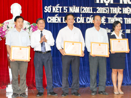 | Ông Nguyễn Xuân Dũng - Cục trưởng Cục Thuế tỉnh trao giấy khen cho các đơn vị |