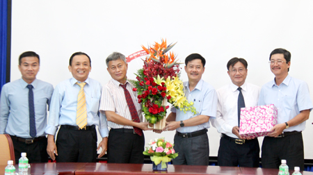 | Đại diện Thường trực HĐND tỉnh cùng lãnh đạo các sở, ngành tặng hoa chúc mừng tại Tổng Công ty Khánh Việt |