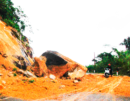 | Một số điểm sạt lở trên Quốc lộ 27C có quá nhiều đá tảng rơi xuống đường |