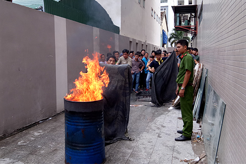 Các học viên thực hiện thao tác chữa đám cháy do xăng dầu.