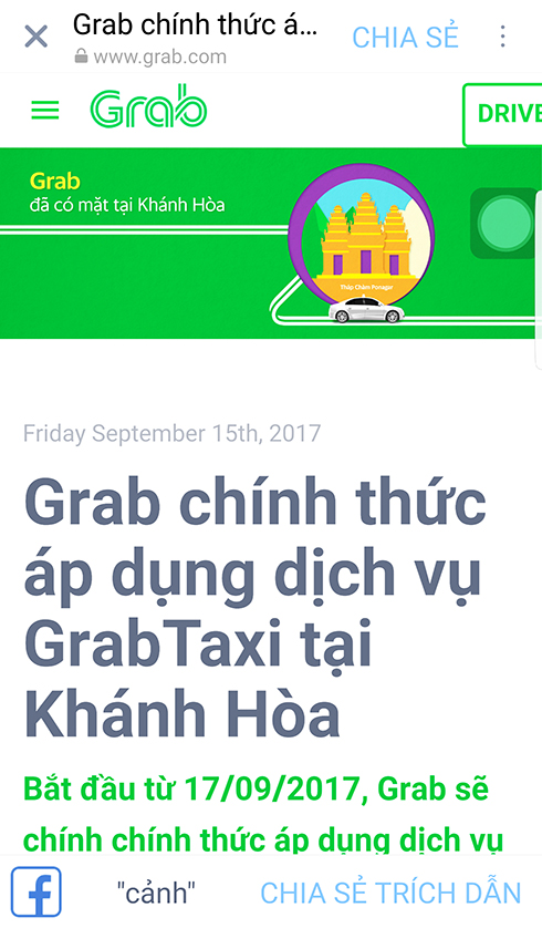 Ngày 17-9, trang web Grab.com đăng tải thông tin dịch vụ Grab taxi chính thức hoạt động tại Khánh Hòa.