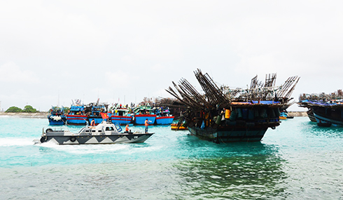Cán bộ, chiến sĩ đảo Song Tử Tây hướng dẫn ngư dân neo đậu tàu cá trong âu tàu để tránh bão |