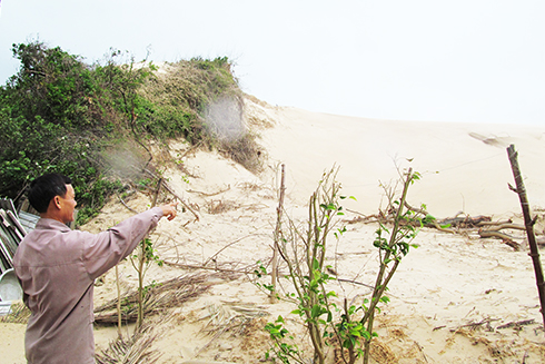 Ông Lê Văn Trao - nhà gần đồi Cô Đơn (trong khu vực động cát) cho biết, bão đã làm tốc mái tôn khiến cát tràn vào nhà, vợ chồng ông phải dọn rửa nhà mất mấy ngày. Còn chuyện cát bay lên mái nhà, rồi rơi xuống mỗi ngày là chuyện thường. Vì thế, khi để thức ăn hay vật dụng gì cũng phải che đậy cẩn thận. Cũng theo ông Trao, nạn khai thác cát làm đìa tôm đang làm cho mật độ cây rừng giảm sút, khiến hiện tượng cát di động tăng lên. Thỉnh thoảng, gia đình ông phải thuê người hốt cát tràn vào nhà.