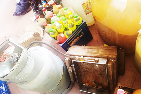 Từ trung tâm thị trấn Tô Hạp, dọc theo Tỉnh lộ 9 về các xã phía tây huyện Khánh Sơn, có hàng chục hộ gia đình kinh doanh tạp hóa kiêm bán lẻ xăng, bình gas. Vào một tiệm tạp hóa bên đường ở xã Sơn Lâm để mua 1 lít xăng, chúng tôi thấy cửa hàng này có nhiều chai, bình nhựa đựng xăng loại 1 lít đã được đổ đầy. Ở gần đó, có một thùng phuy chứa đầy dầu nhớt thải, được gom lại từ các tiệm sửa xe máy. Dưới cái nắng gắt của ngày hè, cùng với hàng chục chai nhựa chứa đầy xăng bày bán ngay trong tiệm tạp hóa, nguy cơ cháy, nổ là rất cao. Chưa hết, khi chúng tôi hỏi mua bình gas mini, chủ cơ sở này ngay lập tức vào phía trong lấy ra một bình còn khá mới để bán cho khách. “Nếu dùng hết, tôi có thể đến đây nạp gas không?”, chúng tôi hỏi. “Các anh phải lên chợ Sơn Lâm, ở đó có người chiết nạp chứ ở đây tôi chỉ bán bình gas mới thôi”, người chủ nói.