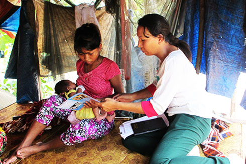 Cán bộ dân số tuyên truyền kiến thức về kế hoạch hóa gia đình tại nhà em Dịnh. |