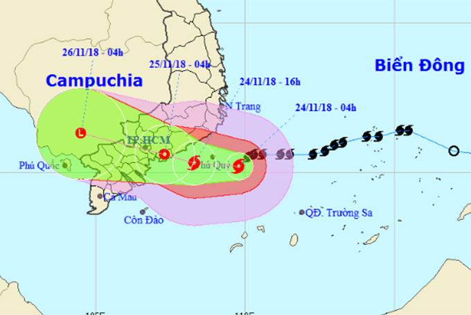 Dự báo trong 12 giờ tới, bão di chuyển theo hướng Tây mỗi giờ đi được khoảng 10-15km. Đến 19 giờ ngày 24/11, vị trí tâm bão ở khoảng 9,9 độ Vĩ Bắc; 108,1 độ Kinh Đông, ngay trên vùng biển các tỉnh từ Bình Thuận đến Bến Tre. Sức gió mạnh nhất vùng gần tâm bão mạnh cấp 9-10 (75-100km/giờ), giật cấp 12. Bán kính gió mạnh cấp 6, giật cấp 8 khoảng 150km tính từ tâm bão; bán kính gió mạnh cấp 10, giật cấp 12 khoảng 50km.