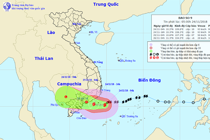 Dự báo trong 12 giờ tới, bão di chuyển theo hướng Tây mỗi giờ đi được khoảng 10-15km. Đến 22 giờ ngày 24-11, vị trí tâm bão ở khoảng 10,1 độ Vĩ Bắc; 107,8 độ Kinh Đông, ngay trên vùng biển các tỉnh từ Bình Thuận đến Bến Tre. Sức gió mạnh nhất vùng gần tâm bão mạnh cấp 9-10 (75-100km/giờ), giật cấp 12. Bán kính gió mạnh cấp 6, giật cấp 8 khoảng 150km; bán kính gió mạnh cấp 10, giật cấp 12 khoảng 50km tính từ tâm bão.