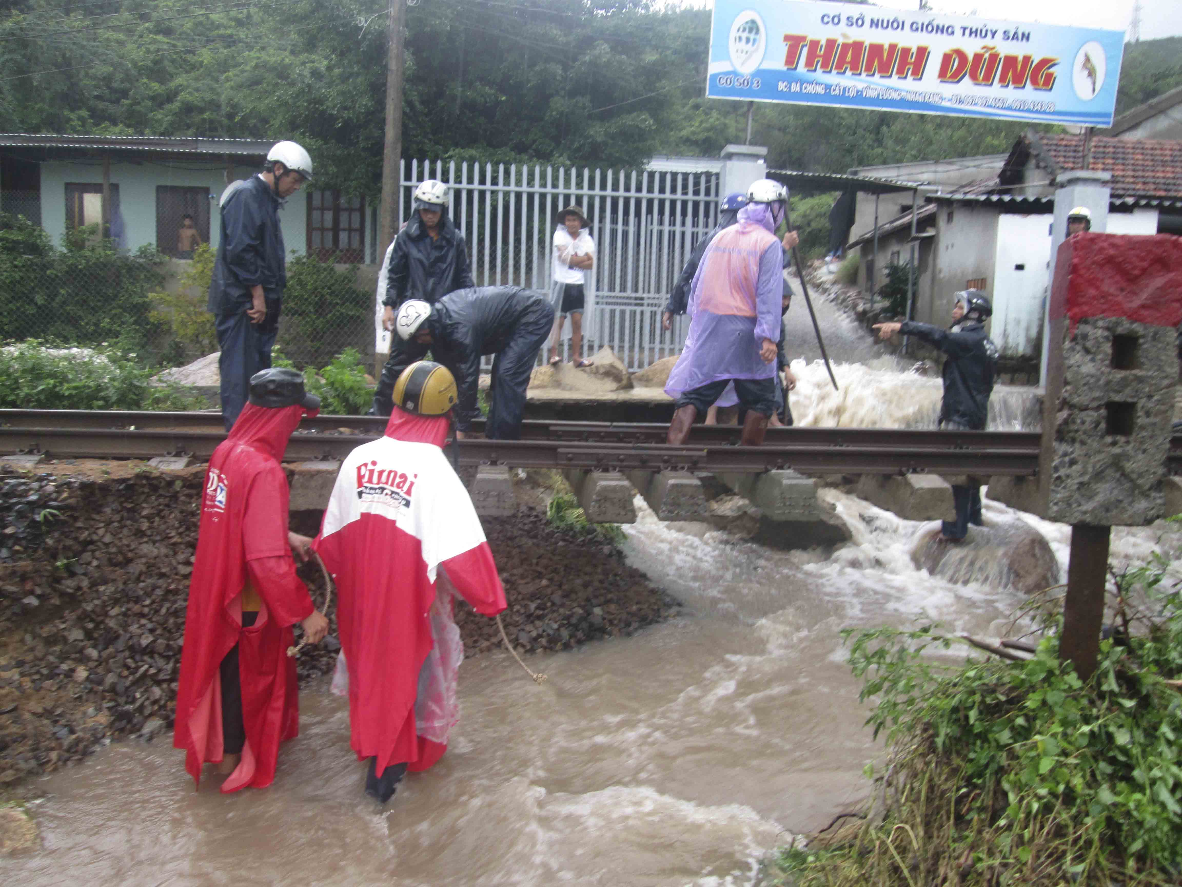 Theo đó, khoảng 21 giờ 30 ngày 24-11, mưa lớn khiến 2 khu vực tại Suối Cát (Cam Lâm) và Ninh Thuận bị ngập đường sắt, khiến 7 đoàn tàu bị mắc kẹt không thể di chuyển.