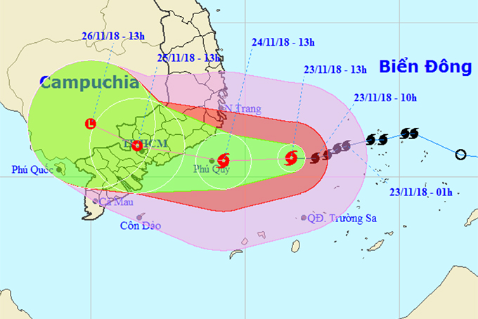 Dự báo trong 24 giờ tới, bão di chuyển theo hướng Tây mỗi giờ đi được khoảng 10-15km. Đến 16 giờ ngày 24-11, vị trí tâm bão ở khoảng 10,5 độ Vĩ Bắc; 108,8 độ Kinh Đông, ngay trên vùng biển các tỉnh từ Khánh Hòa đến Bà Rịa-Vũng Tàu. Sức gió mạnh nhất vùng gần tâm bão mạnh cấp 9-10 (75-100km/giờ), giật cấp 12. Bán kính gió mạnh cấp 6, giật cấp 8 khoảng 220km tính từ tâm bão; bán kính gió mạnh cấp 10, giật cấp 12 khoảng 80km.