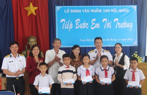 Sáng 9-11, Lữ đoàn 189 Hải quân đến thăm, trao tặng 300 cuốn sách thiếu nhi, 2.000 cuốn vở cho Trường Tiểu học Cam Hải Đông (xã Cam Hải Đông, Cam Lâm, Khánh Hòa) và trao 5 suất học bổng, mỗi suất trị giá 500.000 đồng cho các em học sinh của trường có hoàn cảnh đặc biệt khó khăn.