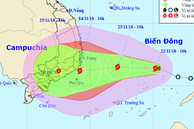 Dự báo trong 24 giờ tới, bão di chuyển theo hướng Tây Tây Bắc mỗi giờ đi được khoảng 15km và có khả năng mạnh thêm. Đến 16 giờ ngày 23/11, vị trí tâm bão ở khoảng 11,5 độ Vĩ Bắc; 112,2 độ Kinh Đông, cách bờ biển các tỉnh Nam Trung Bộ khoảng 320km về phía Đông. Sức gió mạnh nhất vùng gần tâm bão mạnh cấp 9 (75-90km/giờ), giật cấp 11. Bán kính gió mạnh cấp 6, giật cấp 8 khoảng 180km tính từ tâm bão.