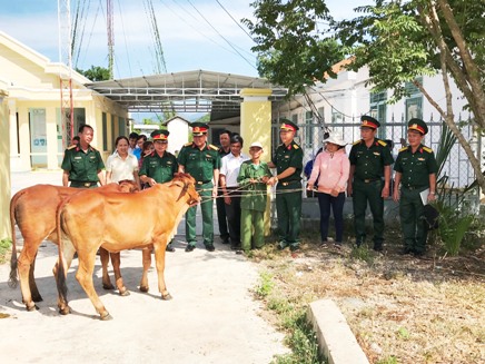 Tại đây, đoàn đã tặng 2 con bò giống (mỗi con trị giá 14 triệu đồng) cho 2 hộ nghèo là gia đình ông Cao Banh (thôn Ba Cẳng), gia đình ông Cao Văn Đưa (Hòn Lay) và tặng mỗi gia đình 1 triệu đồng để có thêm kinh phí xây dựng chuồng trại.