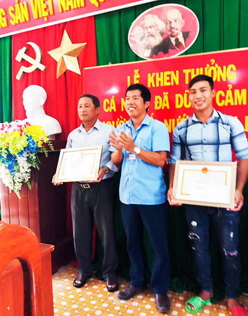 Đại diện UBND xã Vạn Thạnh trao giấy khen cho 2 công dân. |