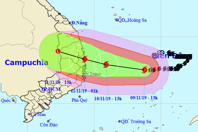 Dự báo trong 24 giờ tới, bão di chuyển chủ yếu theo hướng Tây, mỗi giờ đi được 10-15km. Đến 13 giờ ngày 10/11, vị trí tâm bão ở khoảng 12,9 độ Vĩ Bắc; 110,9 độ Kinh Đông, cách bờ biển các tỉnh từ Quảng Ngãi đến Khánh Hòa khoảng 190km về phía Đông. Sức gió mạnh nhất vùng gần tâm bão mạnh cấp 11 (100-115km/giờ), giật cấp 14.