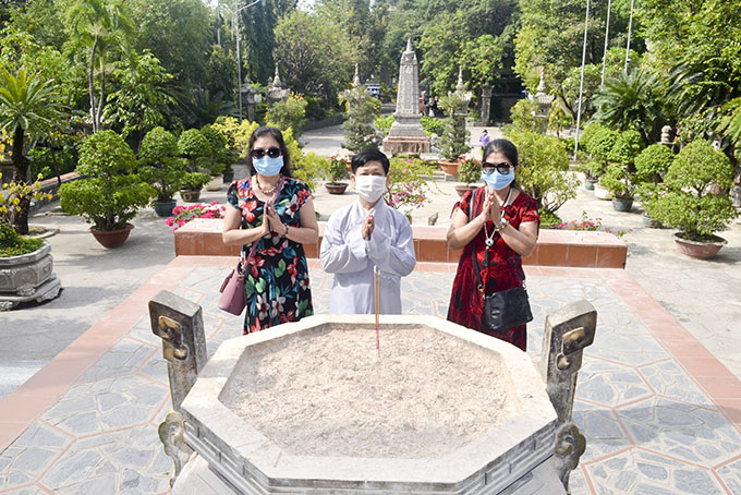 Người dân và phật tử đeo khẩu trang tại chùa Long Sơn.