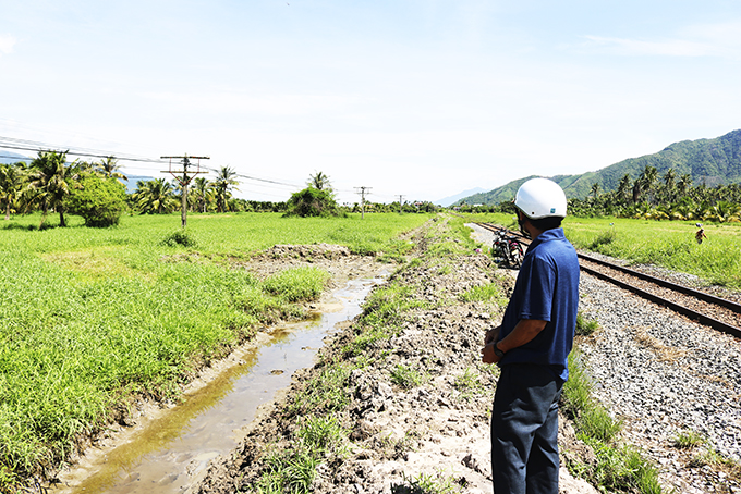 Tiếp cận khu vực này, chúng tôi thấy bốn bề là cỏ. Xa xa, một số ruộng chuyển sang trồng dừa. Cạnh tuyến đường sắt Bắc - Nam là tuyến mương đất của hợp tác xã cũ, cũng là hạ lưu của tuyến kênh thoát nước thải từ Khu công nghiệp (KCN) Suối Dầu chưa được kiên cố. Đây là lý do người dân cho rằng nước thải thẩm thấu vào đất gây ô nhiễm.