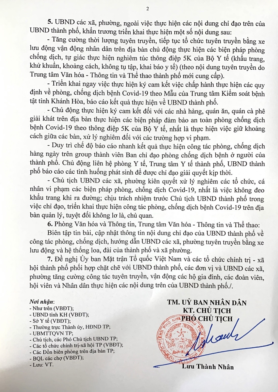TP. Nha Trang cũng đề nghị UBND các xã phường tăng cường tuyên truyền vận động người dân trên địa bàn chủ động thực hiện các biện pháp chống dịch, tự giác thực hiện nghiêm túc thông điệp 5K của Bộ Y tế (khẩu trang, khử khuẩn, khoảng cách, không tụ tập, khai báo y tế); triển khai ngay cho người dân ký cam kết thực hiện nghiêm túc việc thực hiện các biện pháp phòng, chống dịch Covid-19…