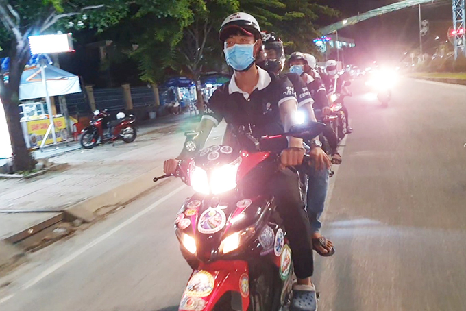 Băng qua những đoạn đường đèo, nhóm hỗ trợ chạy xe chầm chậm, quan sát xem có ai cần trợ giúp. Dưới ánh đèn đường, tiếng xe máy vang lên hòa cùng tiếng cười nói của các thành viên trong đội như thể xua đi màn đêm đang bao trùm con đèo quanh co ven biển. Vượt qua khu nghỉ dưỡng Mia, rồi hướng về con đèo phía trước, nhóm trợ giúp phát hiện một phụ nữ đang chạy xe máy một mình hướng về TP. Nha Trang. Ngay khi nhìn thấy dòng chữ Đội SOS Cam Lâm, người phụ nữ dường như yên tâm hơn khi chạy xe với tốc độ vừa phải. “Chị yên tâm, chúng tôi sẽ cùng chị đi hết cung đường đèo”, anh Cường vội lên tiếng để trấn an người phụ nữ.