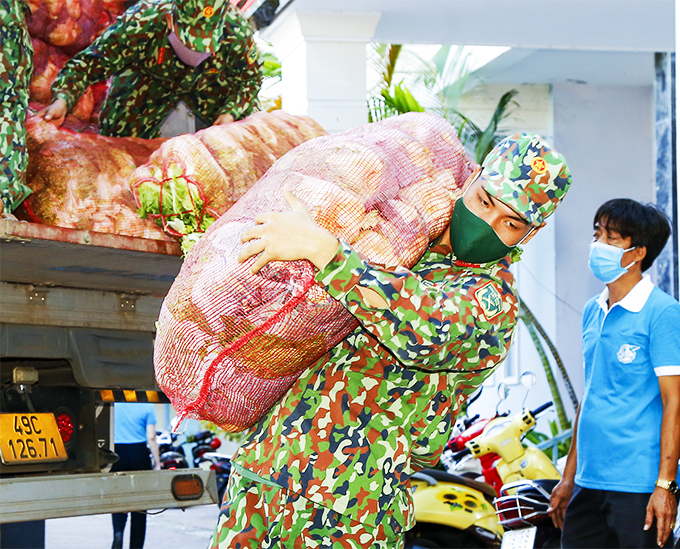 Lực lượng quân đội hỗ trợ bốc dỡ nông sản tại UBMTTQ Việt Nam tỉnh Khánh Hòa. |