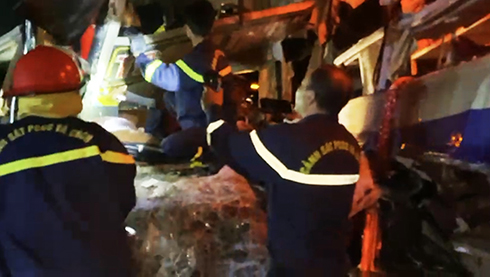 Lực lượng chức năng tiếp cận hiện trường giải cứu tài xế và lái phụ bị kẹt trong cabin
