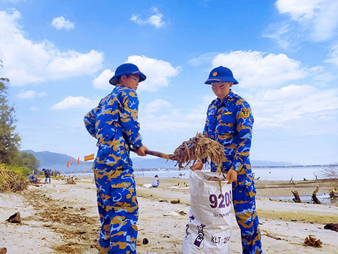 Các đoàn viên thanh niên thu gom rác tại bờ biển