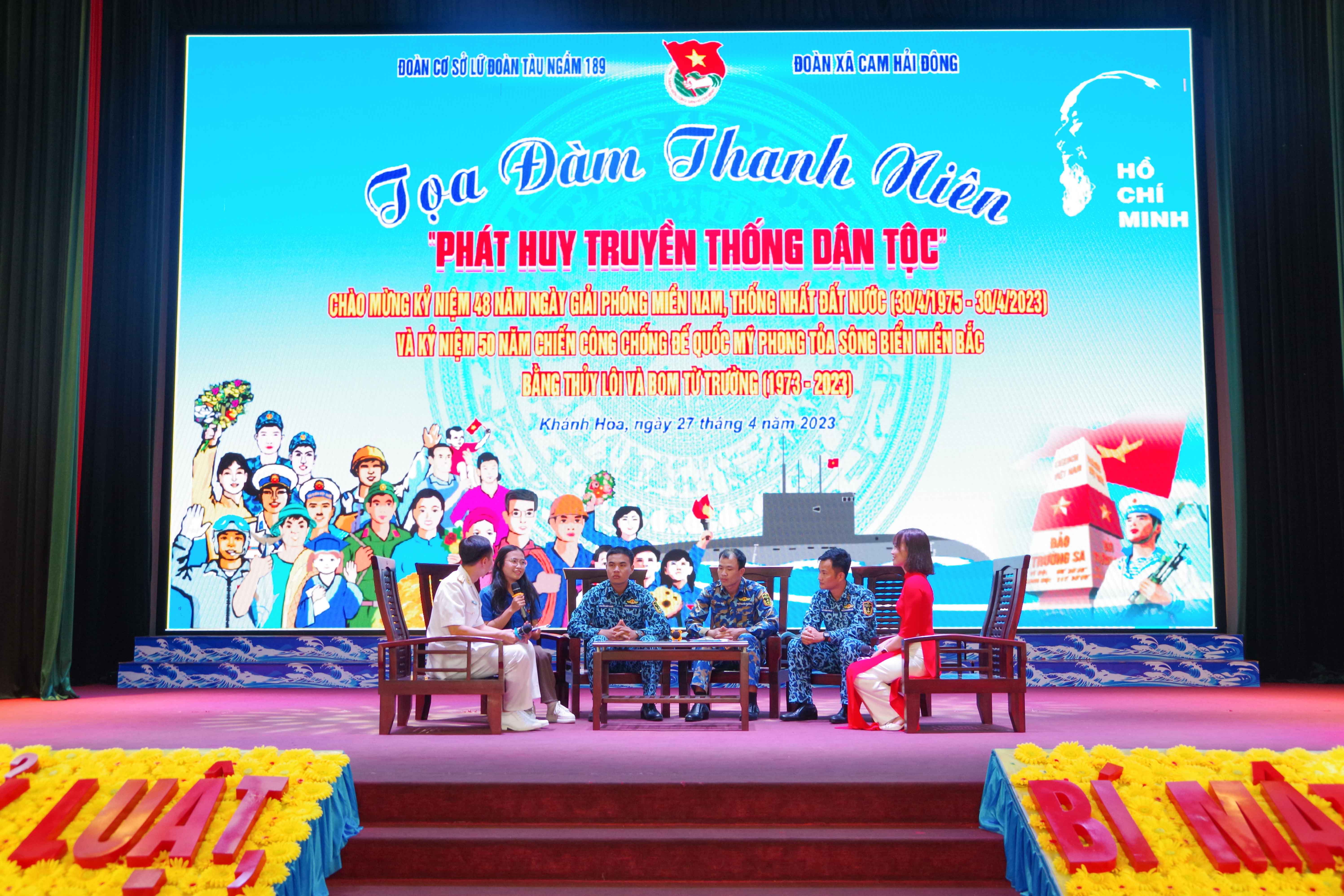 Ngày 27-4, Đoàn cơ sở Lữ đoàn Tàu ngầm 189 Hải quân phối hợp Đoàn xã Cam Hải Đông (huyện Cam Lâm) tổ chức tọa đàm thanh niên “Phát huy truyền thống dân tộc” chào mừng kỷ niệm 48 năm Ngày Giải phóng hoàn toàn miền Nam, thống nhất đất nước (30-4-1975 - 30-4-2023) và 50 năm chiến công đánh bại đế quốc Mỹ phong tỏa sông, biển miền Bắc bằng thủy lôi và bom từ trường (27-6-1973 - 27-6-2023).