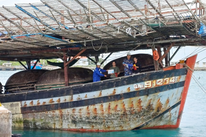 Được biết, tàu cá QNa91234 TS do ông Phạm Như Sa (tỉnh Quảng Nam) làm thuyền trưởng, trên tàu có 40 thuyền viên, tàu hành nghề câu mực. Trong quá trình hỗ trợ, cán bộ của trung tâm đã tổ chức tuyên truyền cho các ngư dân trên tàu về Chỉ thị 45 năm 2017 của Thủ tướng Chính phủ, Luật Thủy sản, hoạt động khai thác thủy sản hợp pháp, đúng quy định của pháp luật; đồng thời, hỗ trợ ngư dân nước ngọt, lương thực thực phẩm, tặng cờ Tổ quốc, áo phao cá nhân...