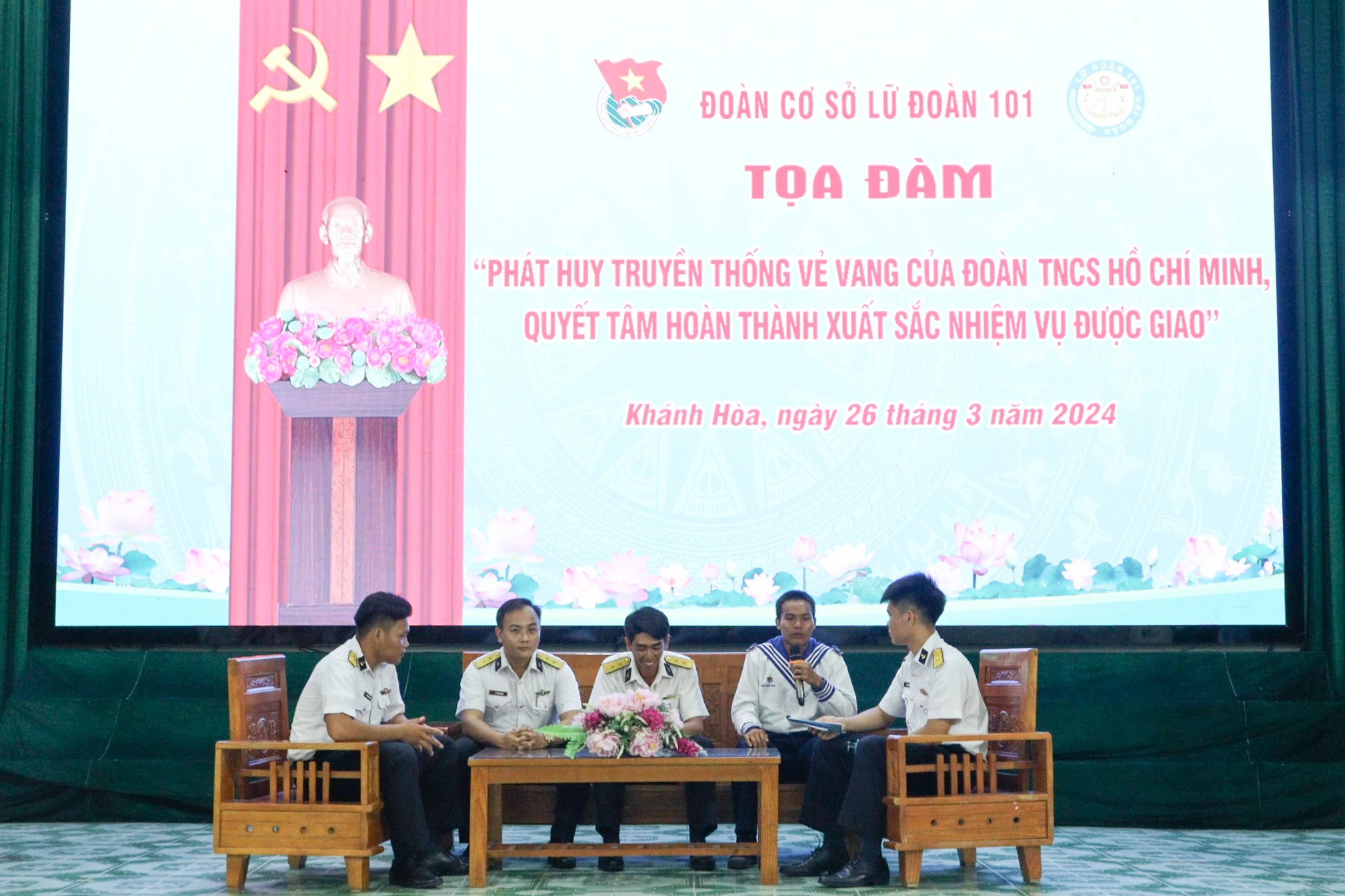 * Tối 26-3, Đoàn cơ sở Lữ đoàn 101, Vùng 4 Hải quân tổ chức Toạ đàm thanh niên với chủ đề “Phát huy truyền thống vẻ vang của Đoàn, quyết tâm hoàn thành xuất sắc nhiệm vụ được giao”. Thượng tá Nguyễn Văn Tạo - Phó Chính uỷ Lữ đoàn dự, chủ trì.