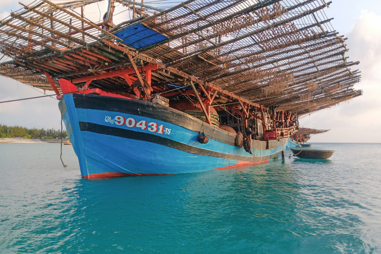 | Tàu cá Qng90431TS neo đậu tại Âu tàu đảo Sinh Tồn để được hỗ trợ sửa chữa. |