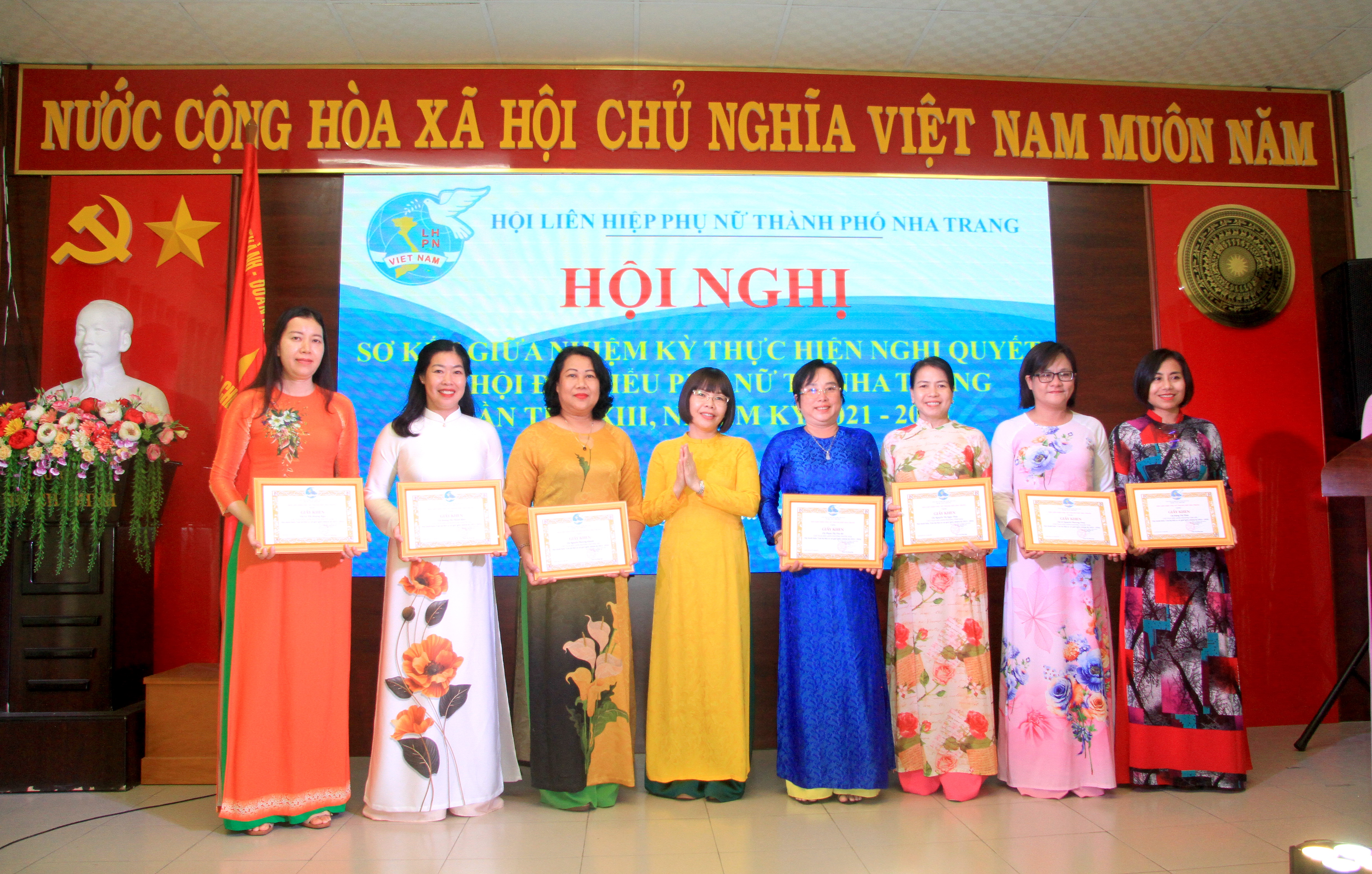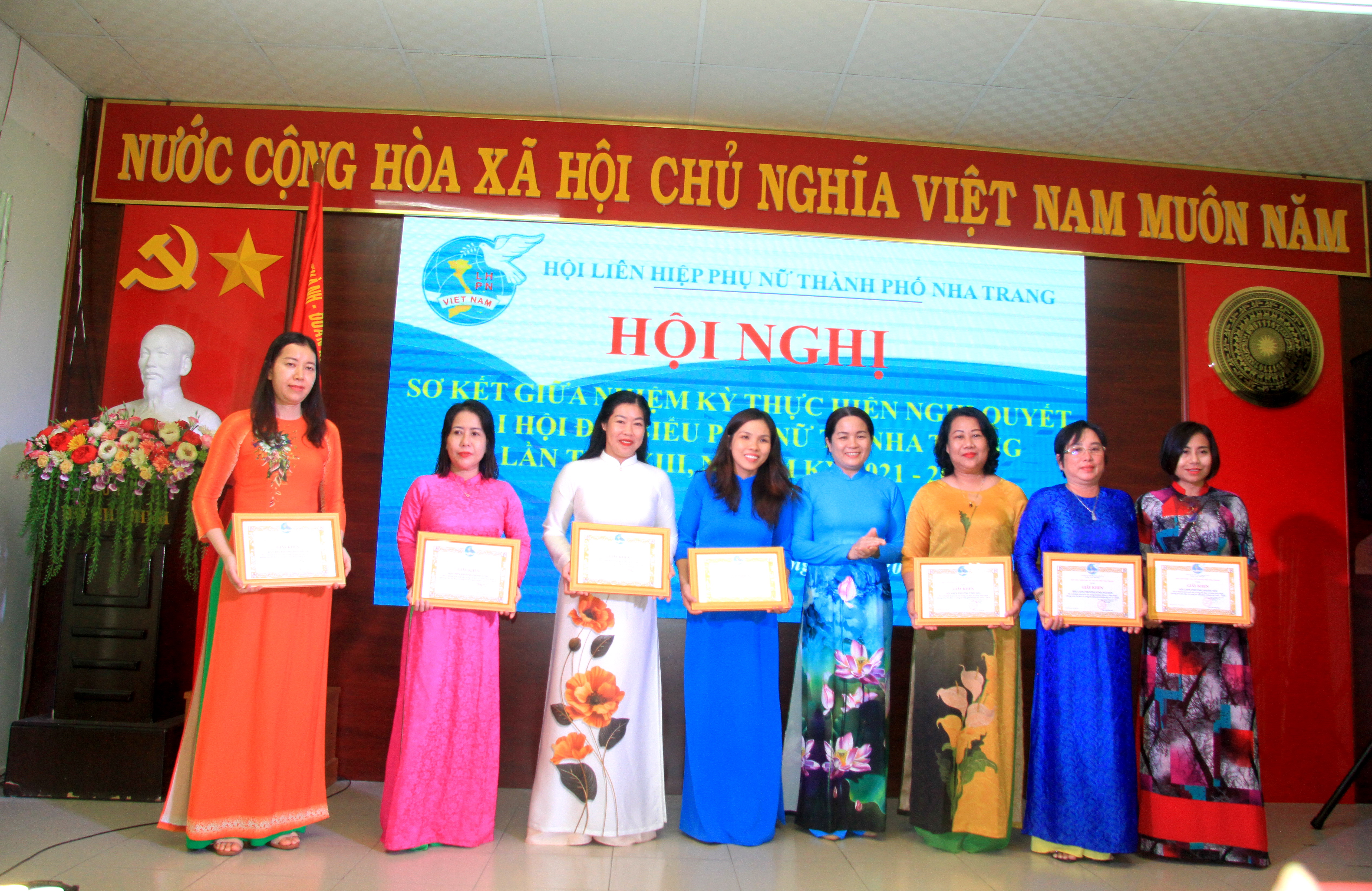 | Lãnh đạo Hội Liên hiệp Phụ nữ TP. Nha Trang tặng giấy khen cho các cá nhân đạt danh hiệu “Cán bộ Hội cơ sở giỏi” giữa nhiệm kỳ. |