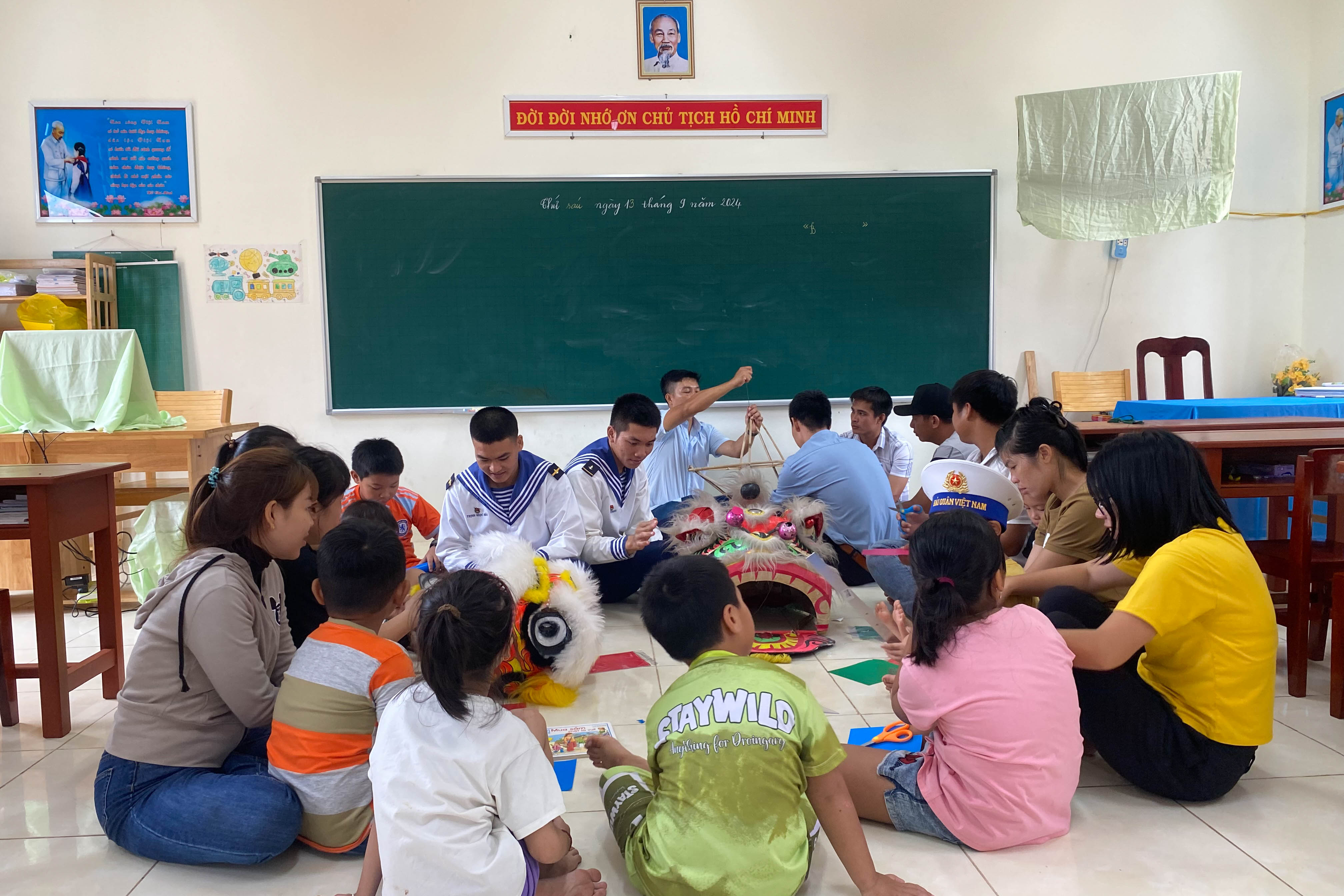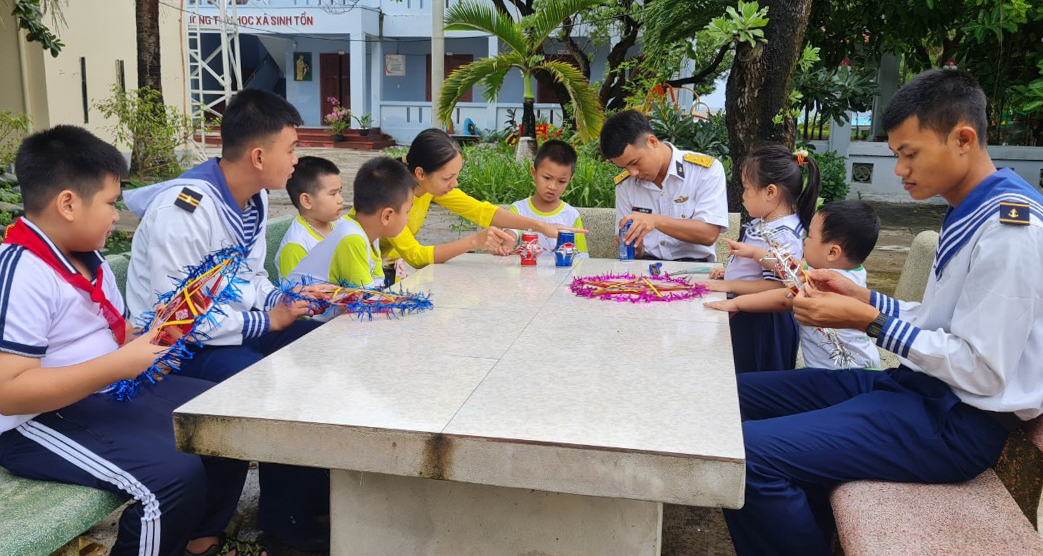 | Cán bộ, chiến sĩ cùng các hộ dân đảo Sinh Tồn chuẩn bị cho Tết Trung thu. |