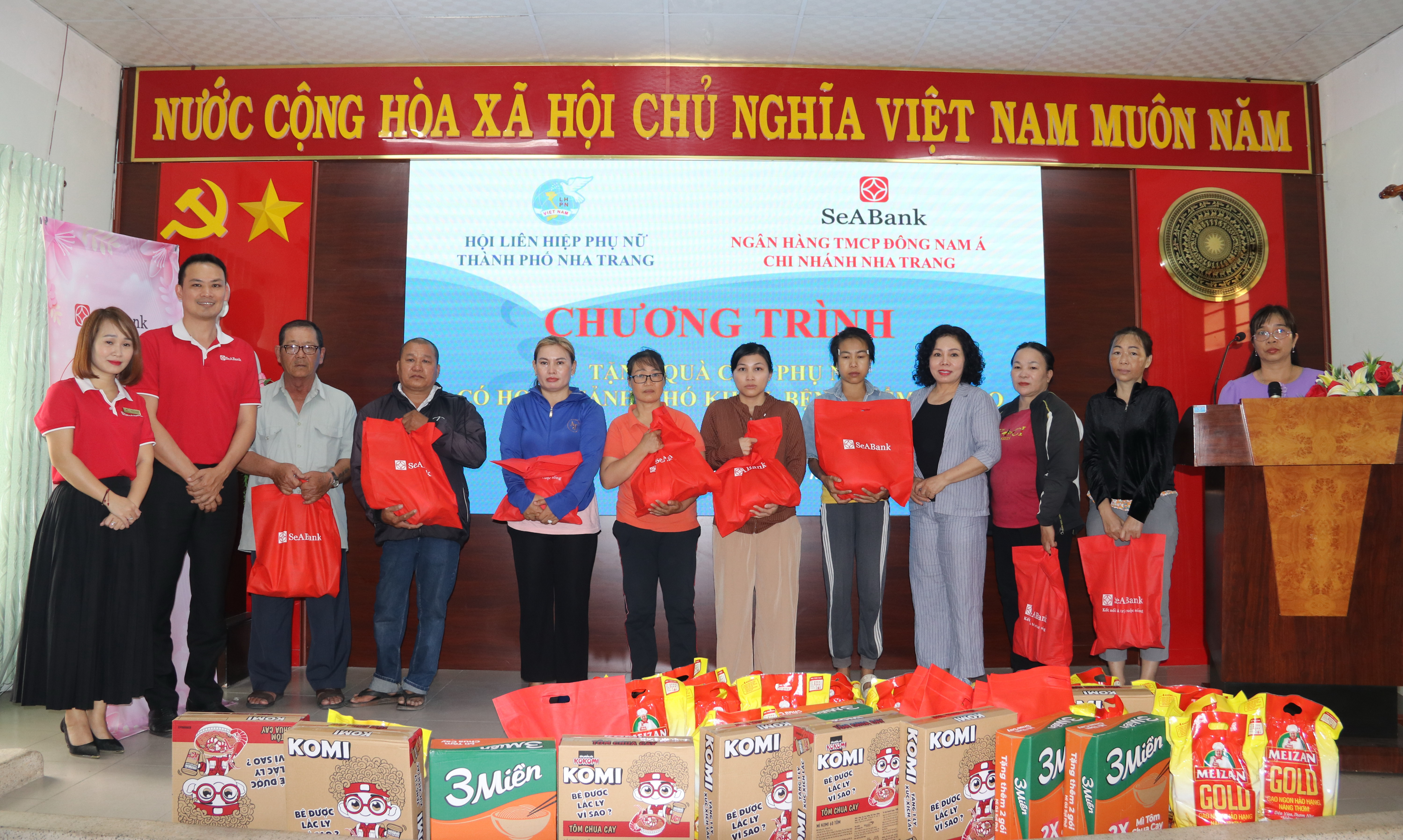 | Hội Liên hiệp Phụ nữ TP. Nha Trang và đại diện ngân hàng tặng quà cho phụ nữ có hoàn cảnh khó khăn. |