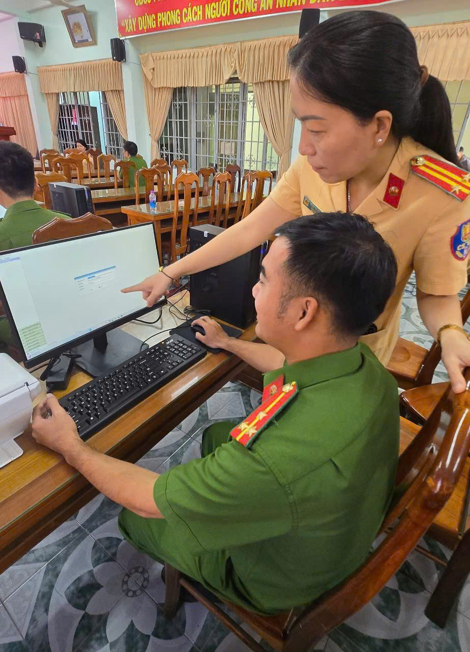 | Cán bộ Phòng Cảnh sát giao thông hướng dẫn thủ tục làm hồ sơ cấp, đổi giấy phép lái xe cho công an cấp xã. |