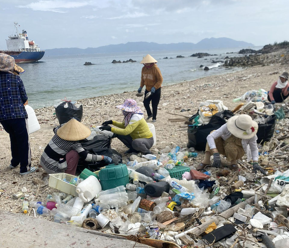 | Các thành viên dọn rác khu vực biển thuộc thôn Mỹ Giang, xã Ninh Phước. |