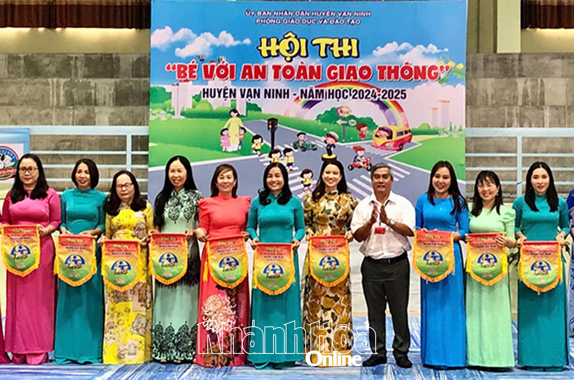 | Lãnh đạo Phòng Giáo dục và Đào tạo huyện Vạn Ninh tặng cờ lưu niệm cho các đội. |