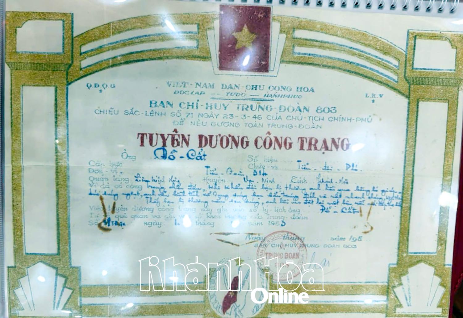 Không chỉ có hiện vật đơn thuần, các di vật, kỷ vật của các liệt sĩ để lại còn là chứng tích sống động của một thời kỳ hào hùng. Tấm bảng tuyên dương công trạng và tờ khai giá thú của liệt sĩ Đỗ Cất (quê huyện Vạn Ninh, hy sinh năm 1954) với con dấu đỏ tươi dù đã phai màu theo năm tháng vẫn như vang vọng tiếng ca của những năm tháng kháng chiến và minh chứng cho tình yêu, sự gắn bó và những gì các chiến sĩ đã đánh đổi vì Tổ quốc, kể cả hạnh phúc riêng tư…