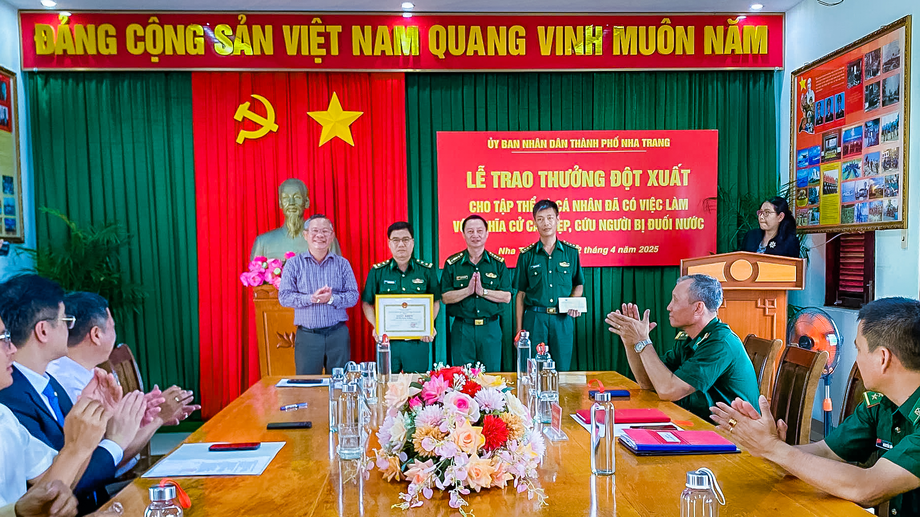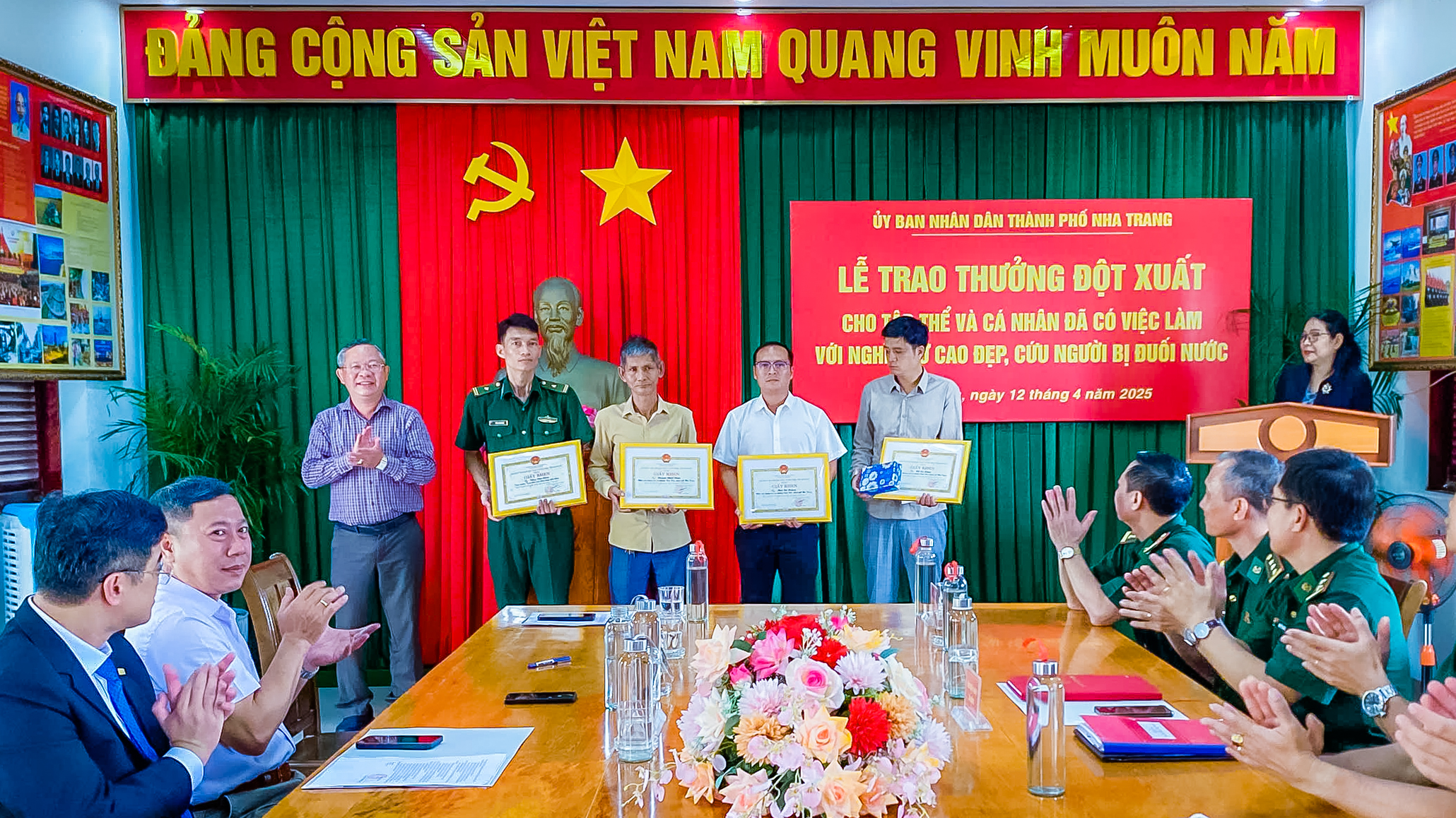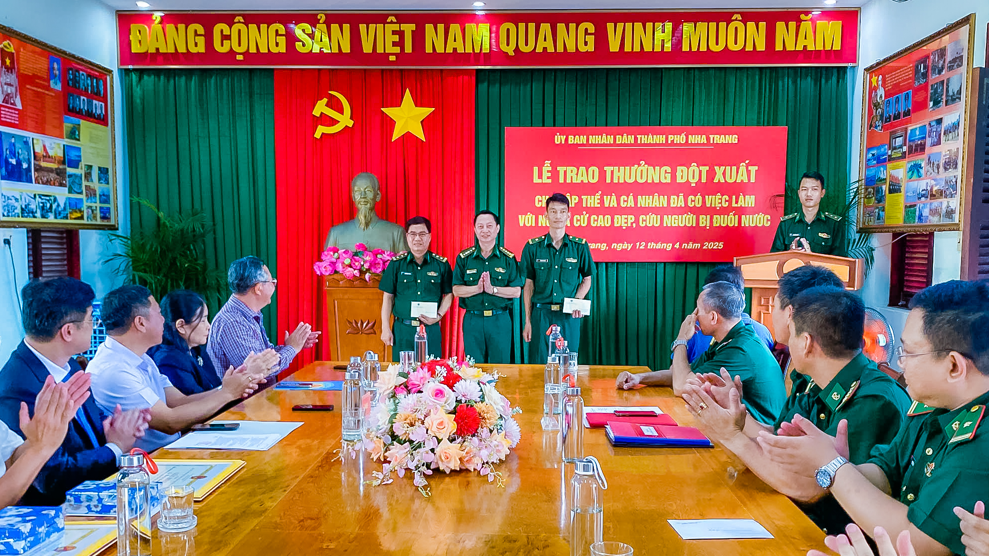 Sáng 12-4, tại Đồn Biên phòng Cầu Bóng, UBND TP. Nha Trang tổ chức lễ trao thưởng đột xuất cho tập thể và cá nhân đã cứu thành công người bị đuối nước. Dự buổi lễ có ông Lưu Thành Nhân - Phó Chủ tịch Thường trực UBND thành phố; Đại tá Nguyễn Doãn Hòa - Bí thư Đảng ủy, Chính ủy Bộ Chỉ huy Bộ đội biên phòng tỉnh.