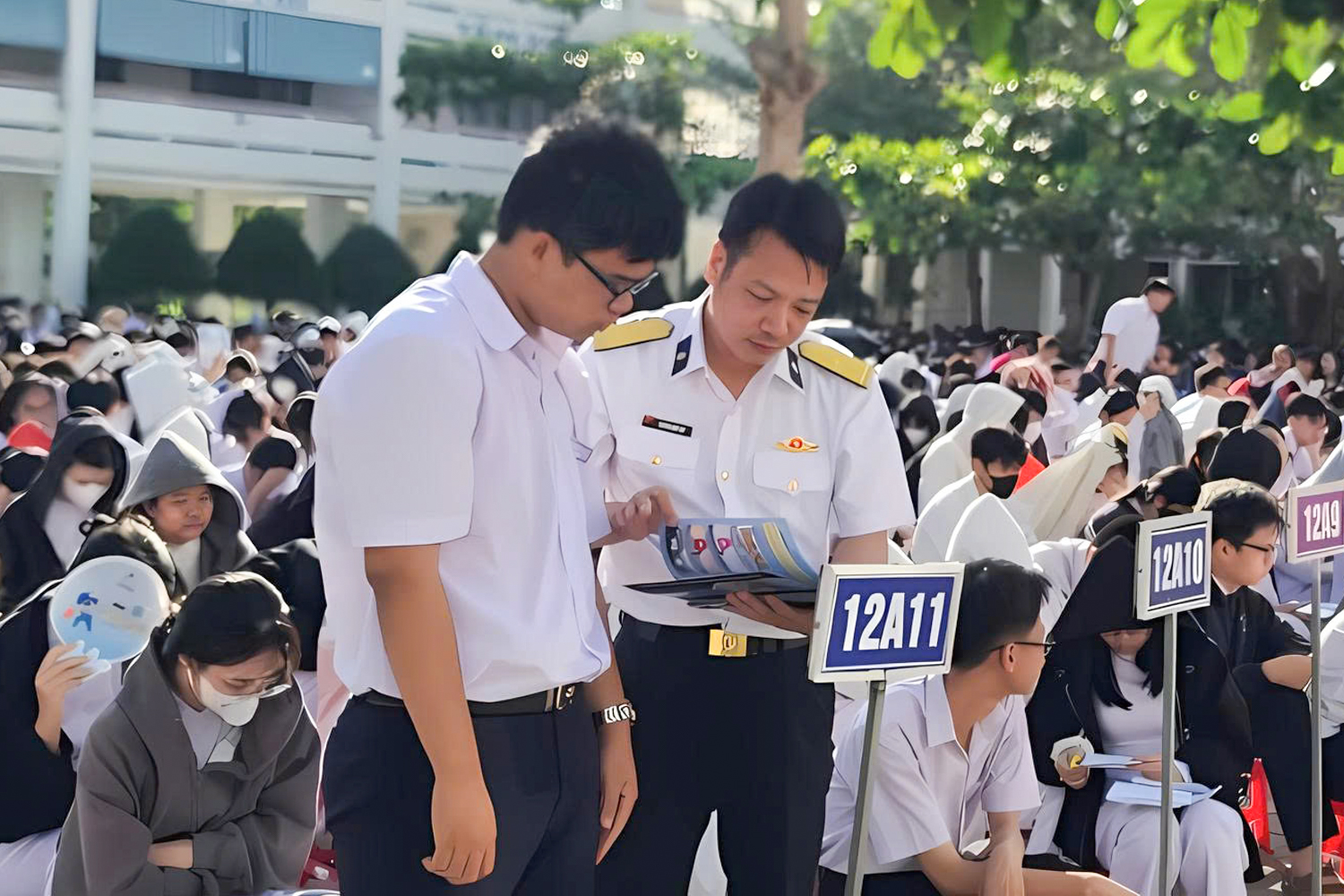 | Cán bộ Lữ đoàn 146 thông tin đến học sinh về điều kiện, quy trình tuyển sinh để trở thành sĩ quan phục vụ trong Quân chủng Hải quân. |