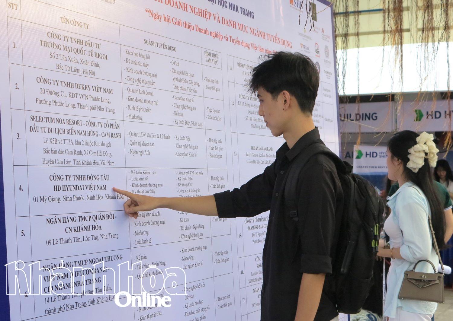 Tại ngày hội, 21 doanh nghiệp thuộc các lĩnh vực như: Ngân hàng, thực phẩm, công nghệ, du lịch, khách sạn, thủy sản… đã giới thiệu hình ảnh, thành tựu và định hướng phát triển thông qua các gian hàng trưng bày tại khuôn viên trường. Đồng thời, tổ chức tuyển dụng trực tiếp hàng trăm vị trí việc làm (toàn thời gian, bán thời gian và thực tập sinh) tại gian hàng với nhu cầu tuyển dụng gần 1.000 nhân sự.