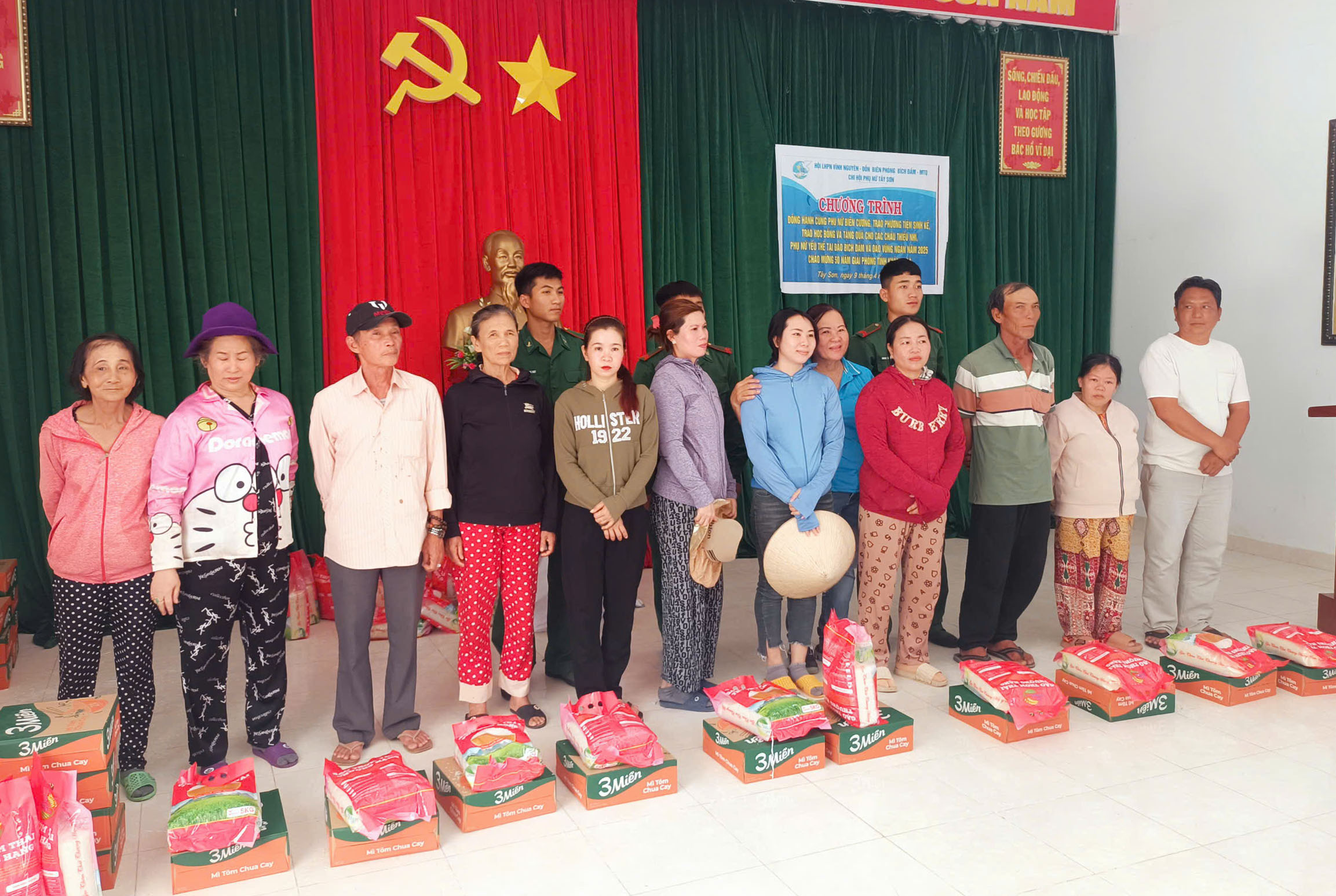 Theo đó, ban tổ chức đã đến tận nhà thăm hỏi và trao tặng 10 phần quà (500.000 đồng/suất) cho hộ gia đình có người mắc bệnh nặng. Đồng thời, trao tặng 130 suất quà (165.000 đồng/suất), gồm gạo và mì gói cho phụ nữ khó khăn; tặng 8 suất học bổng (500.000 đồng/suất) cho học sinh vượt khó học tốt; trao 3 phương tiện sinh kế (2 triệu đồng/suất) hỗ trợ phụ nữ làm ăn, phát triển kinh tế và tặng 220 suất quà gồm bánh, kẹo cho trẻ em ở 2 tổ dân phố Bích Đầm và Vũng Ngán.