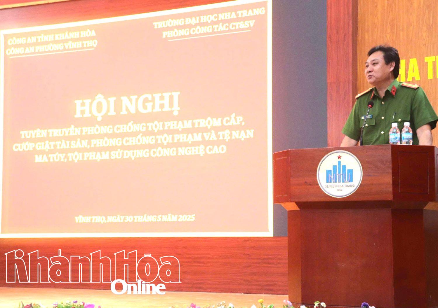 Ngày 30-5, Trường Đại học Nha Trang phối hợp với Phòng Cảnh sát hình sự, Công an tỉnh Khánh Hòa tổ chức Hội nghị tuyên truyền phòng, chống tội phạm trộm cắp, cướp giật tài sản, tội phạm, tệ nạn ma túy, tội phạm sử dụng công nghệ cao cho sinh viên.
