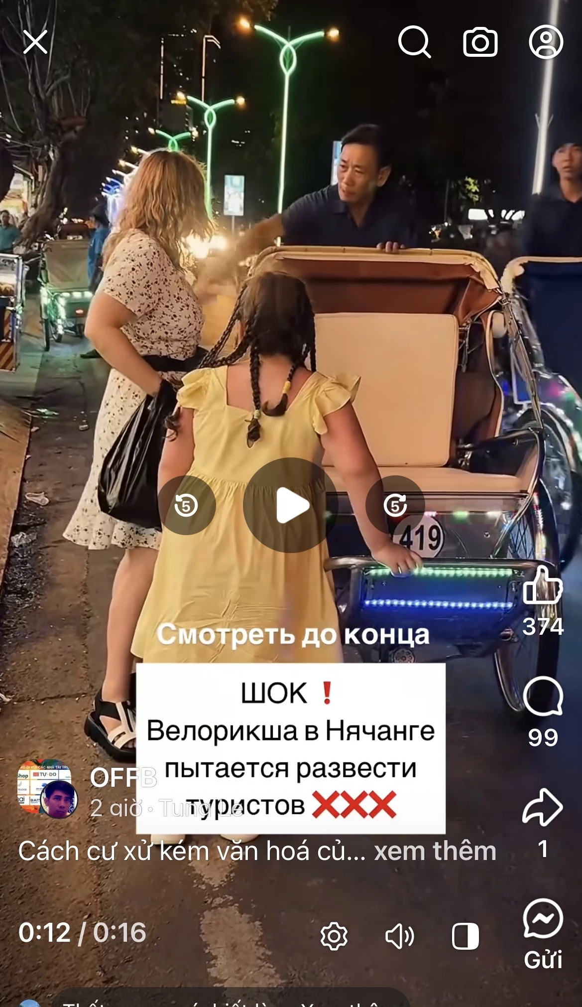 Như Báo Khánh Hòa đã phản ánh, chiều 31-5, mạng xã hội Facebook lan truyền clip video quay cảnh một tài xế xích lô điện ở TP. Nha Trang chở một phụ nữ và một bé gái người nước ngoài. Khi dừng lại trên đường Trần Phú, người phụ nữ nước ngoài lấy tiền ra trả nhưng tài xế xích lô không đồng ý. Tài xế xích lô giơ bàn tay xòe năm ngón, yêu cầu khách phải trả thêm. Tuy nhiên, người phụ nữ nước ngoài không chấp nhận. Lúc này, tài xế xích lô giật mạnh xấp tiền trên tay người phụ nữ nước ngoài.