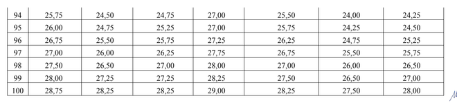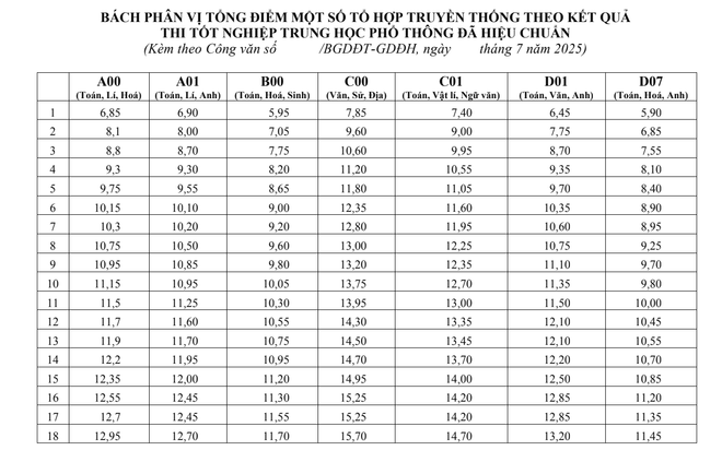 Bách phân vị 7 tổ hợp theo điểm thi tốt nghiệp trung học phổ thông gồm: A00 (Toán, Lý, Hóa), A01 (Toán, Lý, Anh), B00 (Toán, Hóa, Sinh), C00 (Văn, Sử, Địa), D01 (Toán, Văn, Anh), C01 (Toán, Lý, Văn), D07 (Toán, Hóa, Anh).