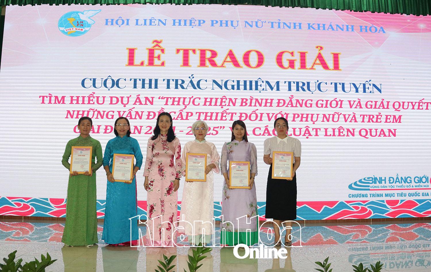 Sáng cùng ngày, Hội LHPN tỉnh cũng tổ chức lễ trao giải cuộc thi trắc nghiệm trực tuyến tìm hiểu Dự án 8 “Thực hiện bình đẳng giới và giải quyết những vấn đề cấp thiết đối với phụ nữ và trẻ em giai đoạn 2021 - 2025” và các luật liên quan.