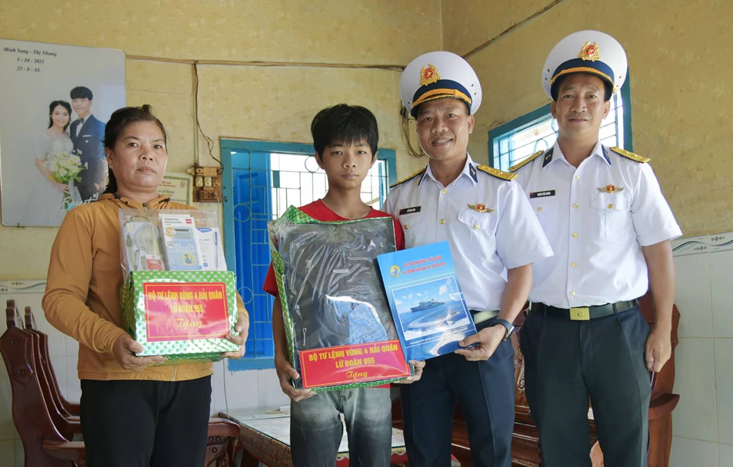 | Chính ủy Vùng 4 Hải quân cùng Lữ đoàn 146 thăm, tặng quà cho cháu Tống Ngọc Phương Nghi (phường Cam Ranh), con ngư dân do Lữ đoàn 146 nhận đỡ đầu. |